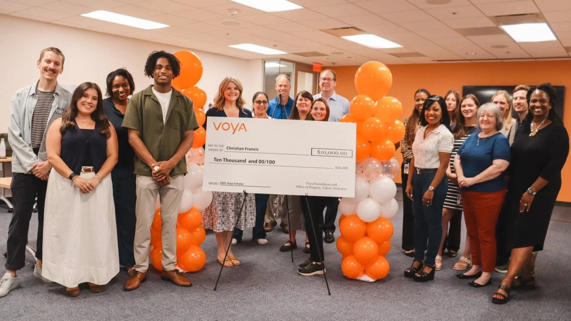 Voya employees surround Christian (Green Shirt), to celebrate their newest scholarship recipient.
